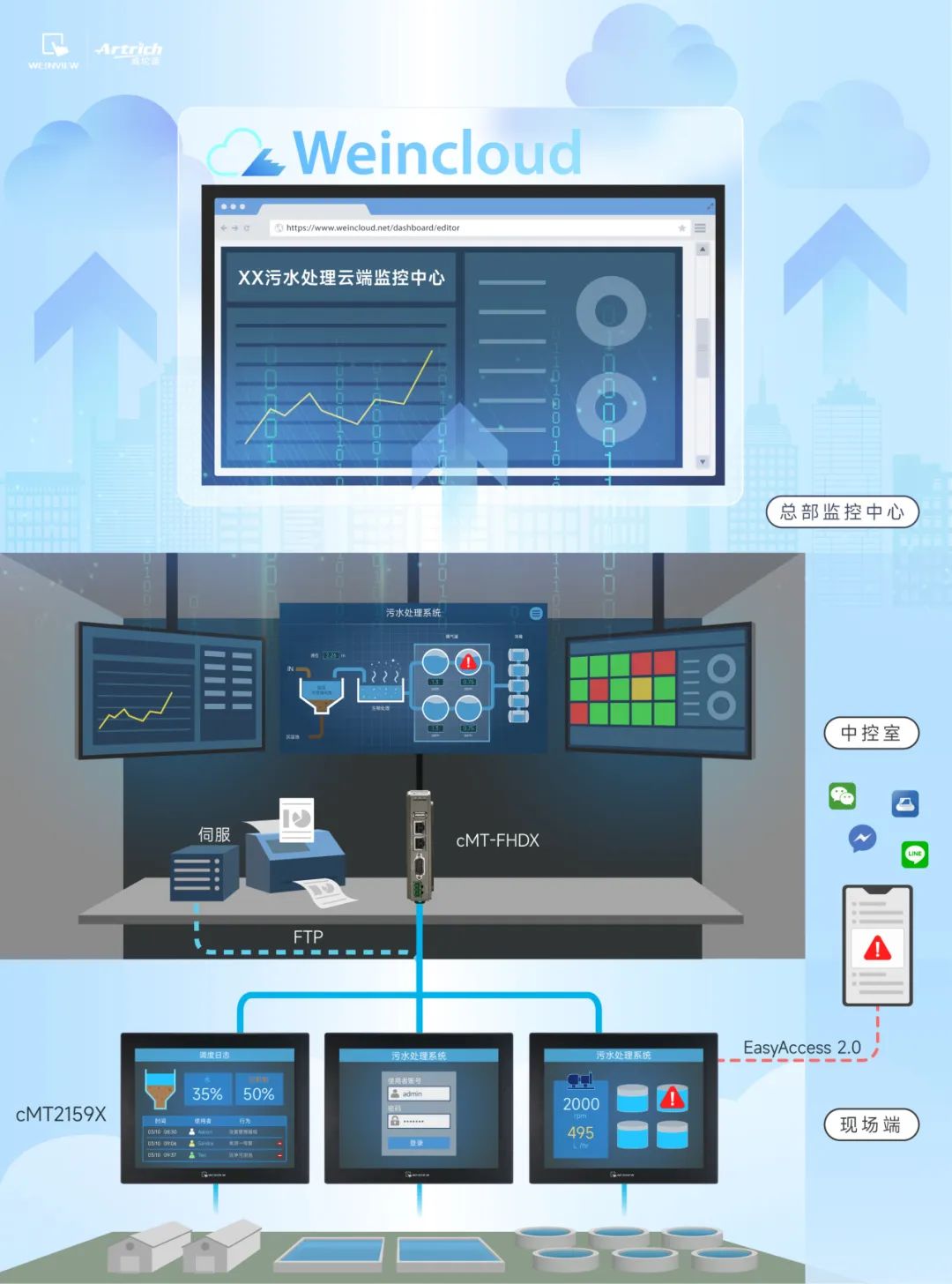 借由 EasyAccess 2.0 遠(yuǎn)程連線服務(wù),管理者對該系統(tǒng)有全面性的監(jiān)控。當(dāng)設(shè)備數(shù)據(jù)異常時,系統(tǒng)立即推送消息,通知人員現(xiàn)場狀況。透過穿透功能,運(yùn)維人員可以直接遠(yuǎn)程從HMI連線至PLC,校對參數(shù)并排除現(xiàn)場問題。
